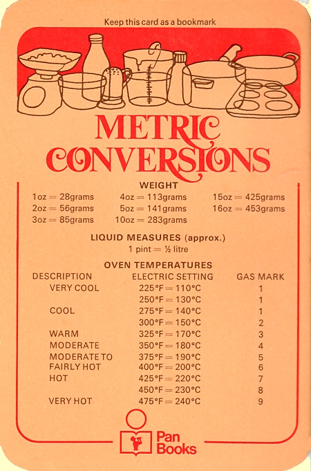 | Laminated bookmark with cookery books listed on one side, conversion chart on the other - probably from 1972 | |