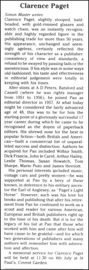 While looking through old copies of ‘The Bookseller’ from 1991 I came across a reference to an obituary for Clarence Paget that was going to appear the next week. I have tracked it down and it can be viewed HERE. Paget was probably most well know for editing ‘The PAN Book of Horror Stories’ taking on the mantle after Herbert van Thal.